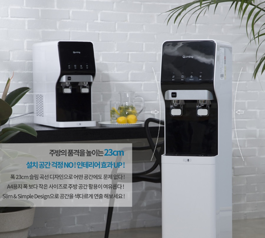 부드러운 느낌의 디자인에 A4용지 폭보다 작은 폭 23cm의 날씬한 큐밍S_Basic 냉온정수기가 설치 공간 걱정을 줄여 드려요.