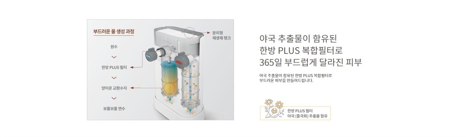 야국 추출물이 함유된 복합필터로 보들보들하게 달라진 피부를 365일 느끼실수 있도록 도움을 주는 연수기 제품이에요!