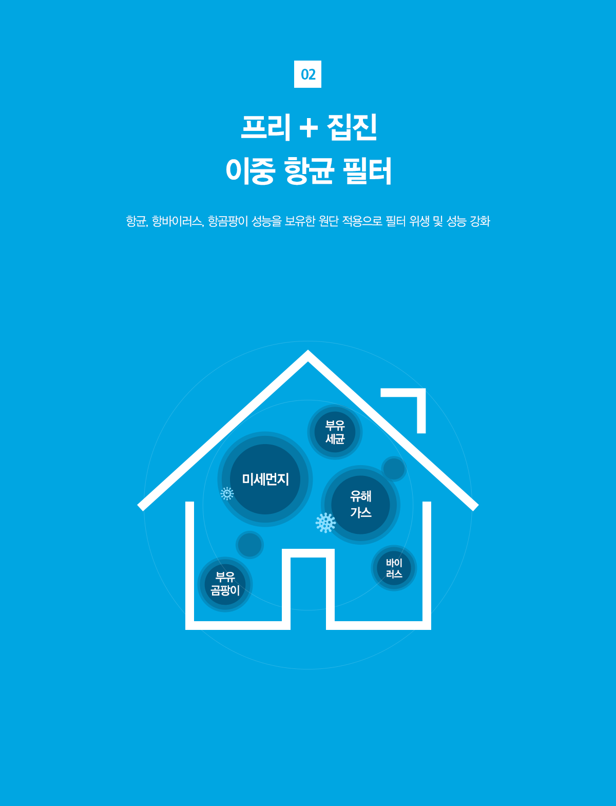 항균,항바이러스,항곰팡이 성능을 보유한 원단 적용으로 필터 위생 및 성능 강화했어요.