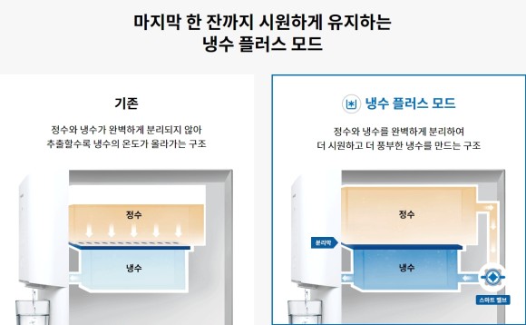 기존 에는 정수와 냉수가 완벽하게 분리되지 않아서