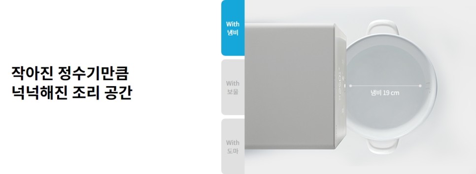 크기는 주방을 더 넉넉하게 사용할 수 있도록 크기는 작아졌으면서도