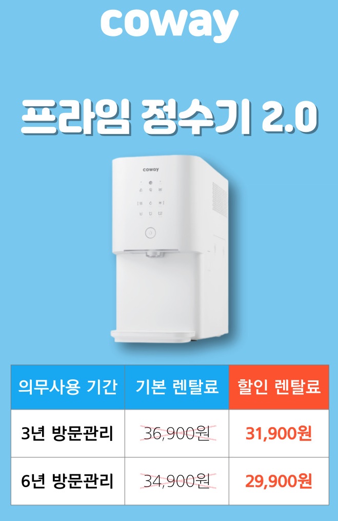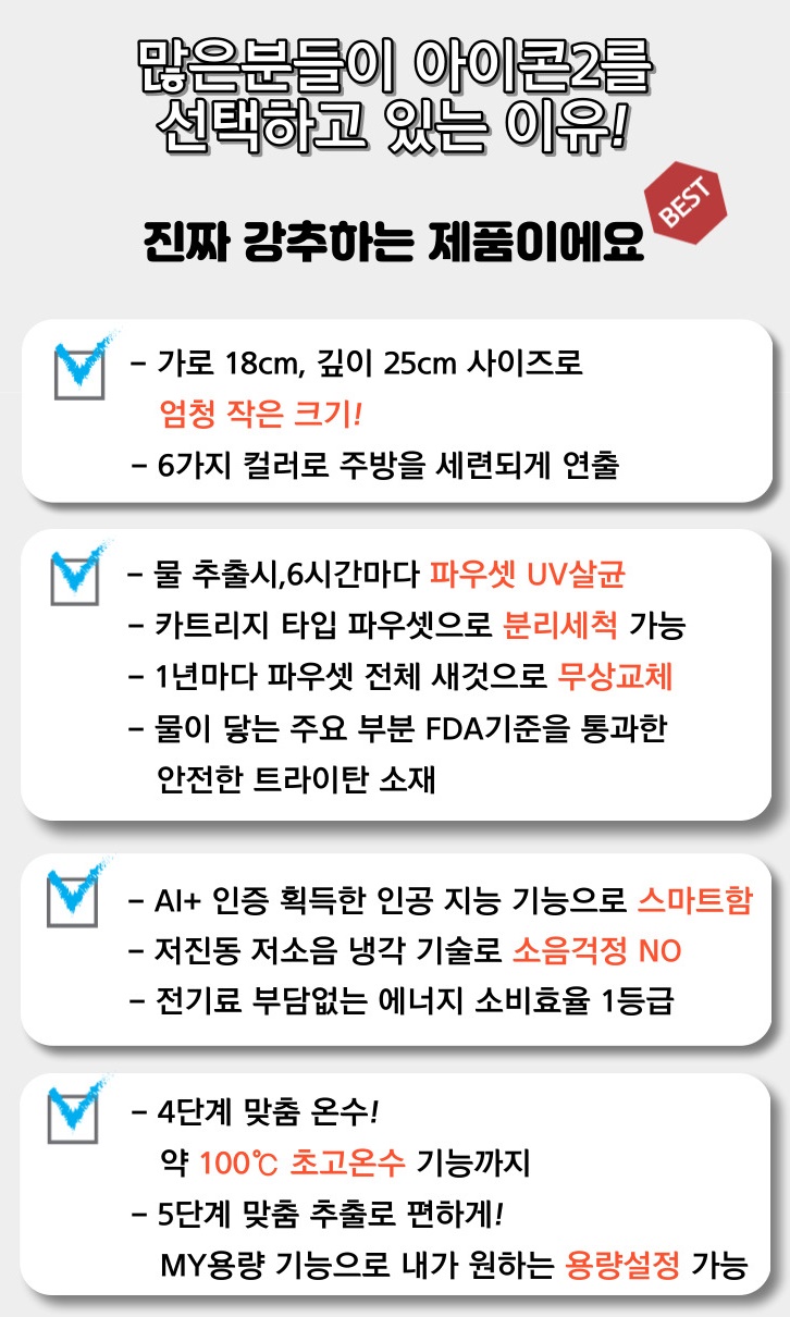 코웨이 정수기들은 정말 다양하게 있다는건 모두들 아는 사실일텐데요! 이번에 여름을 맞이해서 코웨이의 신제품이 또 출시가 되었어요 최근에도 노블 정수기 시리즈가 나왔었는데 이번에 인기를 가장 많이 얻었던 아이콘 정수기가 더 완벽해져서 출시되었는데요! 그래서 갈산코웨이정수기렌탈 추천을 꼭 해드리고 싶어서 이렇게 빠르게 준비해봤습니다! 가정용정수기추천을 아이콘 정수기2로 준비한 이유를 저와 함께 자세히 알아보도록 할게요! 아이콘 정수기들의 특징! 사이즈가 정말 작다는점인데요! 얼마나 사이즈가 작냐면 가로 18cm, 깊이 25cm인데요! 위 이미지에 보이는것처럼 평균적인 싱크대에 정수기를 설치하여도 절반도 차지 하지 않아서 공간이 엄청 여유로워요 게다가 색상이 너무 이쁜데요. 각자 주방의 인테리어나, 컨셉에 따라서 색상을 선택할 수 있도록 총 6가지가 있는데요! 깔끔한 취향에 맞춰 주방을 세련되게 꾸며볼 수 도있고 주방을 트렌디하거나 생기있게 만들어주는 비비드한 컬러까지 준비되어있습니다 위생관리가 더욱더 업그레이드되어서 출시되었는데요. 물 추출 후 매번 살균을 해주면서도 정수기를 사용하지 않아도 6시간 마다 파우셋을 15분씩 깐깐하게 UV 살균을 해주며 1년마다 파우셋 전체를 새것으로 무상 교체해줍니다. 그리고 수시로 분리하여 세척하며 사용할 수 있어요. 물이 닿는 주요 부분이 깨끗한 소재로 되어있어서 필터가 거른물이 지나갈때에도 늘 안심할 수 있으며 더 섬세한 관리가 필요한 파우셋을 수시로 살균해주는것 뿐만 아니라 쉽게 분리하여서 물로 깨끗하게 씻을수도 있어요! 파우셋 분리 방법은 그냥 윗면 커버를 열고 파우셋을 잡고 위로 뽑아주면 끝이라서 내가 원할때 언제든지 번거로운거 없이 세척해줄 수 있죠! 이번에 새롭게 나온 제품인 만큼 요즘 정수기의 트랜드를 모두다 담고 있는 아이콘2 모델인데요! 정수기에서 이제 100℃의 물까지 바로 받아볼 수 있어요. 그래서 온수를 더 확실하게 사용할 수 있으며 기본적인 정량 출수만 있는게 아니고 MY용량이라는 기능이 있는데요! 이 기능은 앱을 통해서 10ml 부터 100ml까지 내가 원하는 대로 설정을 할 수 있는데요! 그래서 요리에 활용하기에도 좋아요! 500ml 기능이 있으니 굳이 라면물 조절할때에는 my용량을 사용하지 않아도되겠죠? 정수기의 핵심인 필터와 공기가 맞닿는 파우셋 전체를 카트리지 구조로 되어있어서 원터치로 교체가 가능합니다! 6개월마다 필터를 교체해주고 1년마다 파우셋을 교체해줘요! 그리고 깨끗한 물을 위해 필터와 파웅셋 교체 주기에 대해서도 스마트 센싱이 있어서 정수기가 파악하여 알림을 해주고 원터치로 교체만 해주면 확인까지 알아서해줍니다. 관리 방식도 내 마음대로 선택할 수 있는데요! 방문관리와 약정관리 중에서 알맞게 선택해보세요! 그리고 셀프관리를 하면서도 정수기 상태를 점검할 수 있도록 AI 기능도 모두 준비되어있어요. 기본적으로 정수기가 똑똑하기 때문에 음성으로 현재의 진행 상황에 대해서 알려주는데요! 이 밖에도 앱을 통해서 제품 상태를 진단하면 제품 내부 센서가 이상을 감지하여 알려줍니다. 간단하게 해결이 가능한 이상 여부일 경우에는 해결 방법을 알려주고 그래도 해결되지 않으면 A/S 접수가 진행되는데요! 센서로 이상 여부를 감지하였기 때문에 더 빠르게 A/S 진행이 이루어집니다. 냉수 추출시 전자 냉각 시스템으로 조용하여 저진동 저소음으로 시원하게 물을 빠르고 풍부하게 출수를 해주며 온수는 직수 시스템으로 되어있어서 순간적으로 가열하여 에너지도 절감해줍니다. 에너지 소비효율 1등급으로 전기료 부담도 없어요. 깨끗한 설계부터 필터 시스템까지 탄탄하여 맛있는 물 맛을 매일 이용할 수 있어요! 요즘은 셀프관리 방식으로 가장 많이 이용하고 계신 추세인데요. 렌탈료가 더 저렴한것 뿐만 아니라 굳이 방문 약속을 잡을 필요없이 간단하게 관리를 할 수 있기 때문이에요. 특히 평일에 시간 조율이 어려운분들이라면 셀프관리가 더욱더 합리적인 정수기 사용이 될 수 있죠 갈산코웨이정수기렌탈을 진행하면서 약정을 선택해야하는데요! 의무 사용 기간 그리고 관리 방식을 선택해야해요! 의무 사용 기간같은 경우에는 3년일때에는 의무사용 3년 이후에는 위약금없이 해지가 가능하시고 5년까지 사용하면 소유권이 이전되요! 그리고 6년으로 진행하셨을때에는 소유권이 이전될때까지 쭉~ 사용하시면 됩니다 약정이 더 길기 때문에 더 저렴한 렌탈료로 사용할 수 있으며 여기서 셀프관리로 진행한다면 더 저렴하게 사용할 수 있죠! 그리고 제휴카드도 활용하여 할인도 받을 수 있으니 가장 합리적인 갈산코웨이정수기렌탈이 될 수 있습니다!^^
